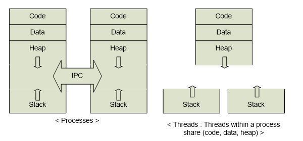 프로세스와 스레드의 분명한 차이로는 프로세스는 자신만의 보호영역을 갖고 있지만 스레드는 자신만의 보호영역을 갖고 있지 않다.