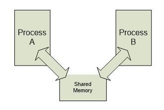 공유메모리는 통신하는 프로세스들간에 메모리를 공유하도록 하는 것이다. 같은 메모리 공간을 공유함으로써 정보교환을 이루는 것이다. 프로세스들은 공유메모리를 자신의 메모리인 것처럼 접근할 수 있다. 하나의 프로세스가 공유메모리를 변경하면 다른 프로세스들은 공유메모리에 접근함으로써 변화의 내용을 알 수 있는 것이다. 공유메모리 방법이 어떤 식으로 동작하는지 데이터베이스 시스템의 동작을 통해 간단히 알아보자. 한 기업의 인사부에서 새로 10명의 신입사원을 채용했을 때 이 기업이 데이터베이스 시스템을 사용하고 있지 않다면 인사부는 기업 내에 각 부서마다 서면 통지를 통해 신입사원이 들어왔음을 통보하게 되고 통보를 받은 각부서는 제각기 입력을 통해 신입사원이 10명 입사하였다는 사실을 자기 부서의 컴퓨터에 기록하게 된다. 그런데 신입사원 연수 도중 1명이 사정에 의해 회사를 그만 두었다면 신입사원이 9명으로 줄었다는 사실을 각 부서마다 다시 서면 통보해야 하는 것이다. 그리고 또 각 부서에서는 다시 또 자기 부서의 컴퓨터에 변경된 사항을 입력해야 한다. 만약 다섯 개의 부서가 있다면 똑같은 과정을 각 부서마다 다시 수행해야 하는 것이다. 오직 한 가지의 변화 때문에 말이다. 여기서 신입사원 1명이 줄어 9명이 되었다는 것을 하나의 프로세스를 통해 데이터베이스-공유메모리-에 변화된 상황을 알려놓으면 모든 부서의 프로세스들은 간단히 그 변화를 깨닫게 되는 것이다. 또 이것은 경리부에서 한 달치 월급을 계산할 때 신입사원 10명의 월급을 계산할 오류가 줄어들게 해준다. 데이터베이스의 데이터가 변화된 순간, 월급을 계산하는 프로세스 역시 그 변화를 즉시 알 수 있기 때문이다. 정보를 공유해 작업을 처리해야 하는 모든 집단(기업, 학교, 병원, 경찰서, 동사무소, 대형매장 등)은 바로 공유메모리를 바탕으로 한 데이터베이스를 사용하고 있어 정보교환에 편리와 안전을 함께 이루는 것이다.