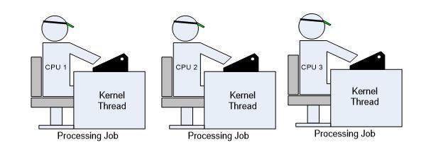 직원이 세 명 있는 동사무소가 있다고 하자(스레드). 그들은 동사무소의 물건들을 공유할 수 있지만 각각 전문화된 기능들을 수행할 수 있을 것이다. 결국은 동사무소를 이용하는 주민들이 보다 질 높은 서비스를 제공받게 될 것이다.