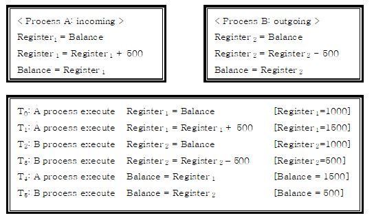 여러 프로세스의 접근이 가능한「공유된 데이터」에 여러 프로세스들이 동시에 접근했을 경우 과연 어떠한 문제가 발생하게 될까. 체계적인 접근방법을 만들어 놓지 않는다면 예측하지 못했던 결과가 나올 가능성이 있다. 이러한 가능성을 배제하기 위해 Synchronization의 개념이 도입되었다. 예를 들어 은행에 1000원의 잔고가 남아 있다고 하자. 통장의 주인이 500원을 찾는 순간 동시에 고향 어머니께서 500원을 송금해 오셨다면 어떤 결과가 발생할까. 우리가 바라는 결과값은 두말할 나위 없이 바로 1000원인데 말이다. 그러나 그 결과값이 500원이 나왔다면 또는 1500원이 나왔다면 이것은 엄청난 문제가 아닐 수 없다. 어떻게 이런 결과값이 나올 수 있었을까. 바로 공유 데이터, 은행 잔고 1000원에 A프로세스(500원 인출)와, B프로세스(500원 송금이 동시에 접근해 각각의 프로세스가 서로 다른 결과를 갖고 있기 때문이다.