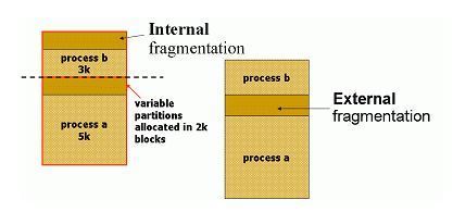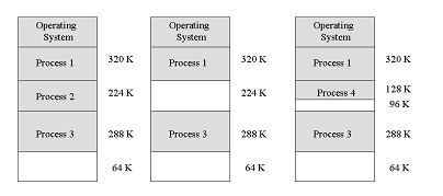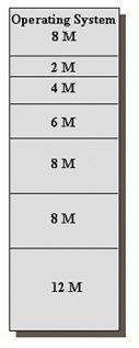 위의 세가지 방법 중 메모리의 낭비를 가장 적게 가져오는 것은 바로 variable unit이다. 그러나 이러한 방법은 또 별도의 관리가 필요한 것이다. 메모리를 효율적으로 이용하기 위해 다양한 방법으로 메모리 영역을 나누는 방법을 계속해 개발해 나갔지만 단편화의 문제는 여전히 존재하고 있었다. 다양한 프로그램마다 다양한 크기를 갖고 있기에 메모리를 분할한다 하더라도 아래 그림과 같이 조각이 남기 마련이다.
