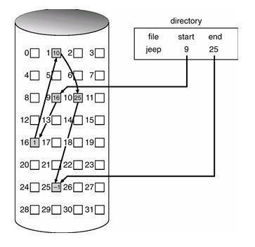 연속할당 방법의 단점은 하나의 파일을 인접한 섹터을 할당하여 채움으로서 그만큼 디스크가 효율적으로 사용되지 못하다는 것 이었다. 디스크 곳곳에 사용되지 않은 블록이 있다 하더라도 그 블록이 현재 저장해야하는 파일의 크기보다 작다면 사용될 수 없기 때문이다. 디스크 공간을 보다 효율적으로 운영하는 방법을 고심하던 시스템 설계자들은 블록을 리스트로 연결해 블록이 디스크상에 떨어져 있어도 하나의 파일을 할당할 수 있는 linked list allocation을 구상하기 시작했다. 여러 개의 디스크블록이 필요한 파일을 저장할 때 인접한 섹터가 아니더라도 저장이 가능한데 이 이유는 파일의 가장 앞부분을 저장한 블록이 그 다음 저장 블록이 어느 곳에 위치해 있는지 포인터를 통해 알려주기 때문이다. 만약 10개의 떨어진 블록이 사용되었다면 각자 다음 순서의 블록이 어디 위치해있는지에 관한 정보를 갖고 있는 것이다. 시스템 사용 중 데이터를 삽입하거나 삭제하는 등의 행동은 바로 파일 크기의 변화를 가져온다. 이렇게 파일의 크기가 동적일 때 즉, 디스크 블록이 더 필요한 경우가 발생했을 때 필요한 블록이 디스크상에 어느 위치에 있다하더라도 포인터를 통해 연결이 가능하므로 편리하다.