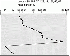 헤드가 가장 안쪽에서 바깥쪽으로 먼저 스캔하게 된다면 0부터 헤드가 이동하여 12, 16, 30, 45, 80의 데이터를 처리하고 트랙의 가장 바깥쪽까지 스캔하게 된다. 만약 30을 처리한 직후 28 위치에 데이터가 요구된다면 헤드의 이동방향과는 다른 요구이기 때문에 바깥쪽 끝까지 스캔이 끝난후 다시 안쪽끝으로 스캔할 때 처리되어 지는 것이다.