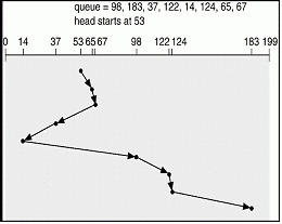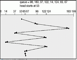 FCFS는 요구가 들어온 순서대로 헤드를 움직이는 방법이다. 이 방법의 가장 큰 장점은 프로그래밍하기 간단하고 사용자들에게 공평하다는 것이다. 먼저 요구되어진 데이터를 가장 먼저 찾는다면 불만을 표시할 사람은 없을 것이다. 그러나 불만이 없다고 하여 그것이 최선의 방법일 수는 없다. FCFS의 방법은 데이터 처리 요구가 상호 연관성이 없기 때문에 임의로 해드가 움직여야 한다. 예를 들어 번호가 0부터 99인 100개의 트랙이 있다고 하자. 다음과 같은 순서로 (12, 45, 80, 16, 30) 데이터를 찾는 요구가 발생했을 때 헤드의 이동 거리를 계산해보자.
