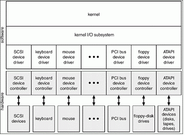 I/O시스템은 커널을 통해 명령받게 된다. 이러한 명령들은 계속해서 쏟아져 나올 때 커널은 어느 명령을 먼저 처리할 것인지에 관해 조절기능을 하게 된다. 이렇게 하나의 명령이 주어지면 장치구동기(Device driver)를 통해 추가 명령이 실행될 주변장치를 제어, 관리하게 되고 이어 장치제어기(Device controller)를 통해 실행 하드웨어가 작동되는 것이다.