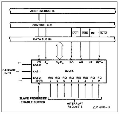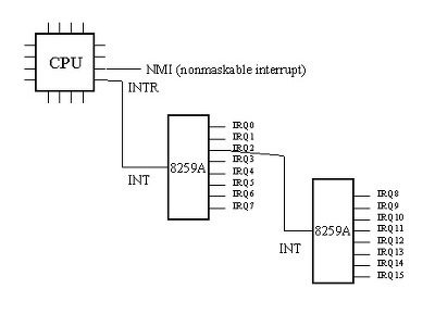 original PC나 XT에서는 하나의 8259칩을 사용하였는데, 위의 그림에서 보시다시피, 최대 8개까지의 장치를 연결할 수 있었습니다. 8259A 는 이들을 직렬연결(cascade)을 통해 최대 64개의 장치까지를 연결할 수 있게 되어있습니다. AT이후부터는 이 8259A 2개를 연결하여 총 16개의 interrupt를 처리하고 있습니다. 여기서 눈여겨볼 pin은 IRQ0부터 IRQ7까지의 외부 device controller와 연결되는 IRQ선과, CPU의 INTR pin에 연결되어 interrupt를 요청하는 INT선, 그리고 CPU로부터 interrupt에 대한 ack를 받는 INTA pin입니다. 개념적으로 나타내면 다음과 같이 그릴 수 있습니다.