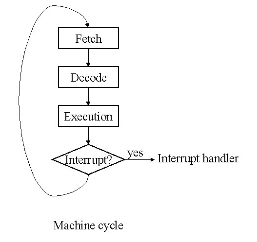 현대 컴퓨터는 대부분 Interrupt-driven 기법으로 인터럽트를 활용합니다. 이 기법은 정상적인 프로그램의 실행 도중 발생한 사건을 해결하기 위해 잠깐 다른 부분을 실행한 이후에 다시 원래 실행하던 것을 계속해서 실행합니다. 대표적으로 I/O처리로 외부 장치들과 의사소통하기 위해서 Interrupt라는 방식을 사용합니다. 이 Interrupt는 CPU가 정신없이 일하고 있을 때, IO 장비들이 당장 작업이 필요할 때 Interrupt라는 신호를 줌으로써 CPU에게 알리는 것입니다. 이와 대조적으로 예전 Apple같은 경우 Polling이라는 방식을 썼었습니다. 이 방식은 CPU가 한 명령어(Instruction)이 끝날 때마다 I/O 적업을 검색하여 작업할 I/O가 있는지를 살펴보는 기법이었습니다. 매우 비효율적이라고 할 수 있습니다. 당연히 Interrupt 방식이 효율적입니다. 그 반대급부로 Interrupt는 구현이 복잡하다는 단점이 있습니다. 구현이 간단한 Polling의 경우, 먼저 스캔하는 IO 슬롯이 자연히 높은 우선 순위를 가지게 됩니다. Interrupt의 경우 우선순위는 하드웨어적으로 어떻게 Interrupt를 구현하느냐에 달려있습니다. CPU의 pin들중에 하나에 interrupt request있습니다. I/O 장비들 중에서 interrupt가 일어나면 이 line에 신호가 걸리게 되고, CPU는 machine cycle을 돌던중에 마지막에 이러한 신호를 체크하게 됩니다. 이때 interrupt가 있다면 interrupt handler로 제어를 옮깁니다.