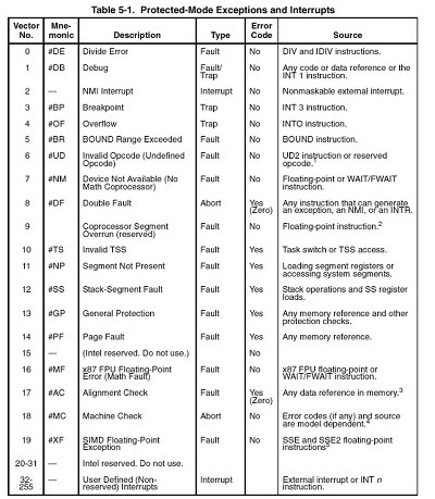 이러한 모든 interrupt나 exception들은 0에서 255까지의 숫자로 구분됩니다. (할당됩니다.) 이러한 숫자를 interrupt vector라고 부릅니다. PC에는 interrupt vector table이 있어서 이 table에서 각 interrupt가 들어올 때 그것들에 대한 vector번호를 가지고 처리할 handler의 주소를 얻을 수 있게 되어있습니다. (386이후에는 기본적으로 같지만 좀더 복잡합니다.) 따라서 모든 interrupt나 exception들은 vector값을 가지고 있으면서, 해당 interrupt나 exception이 발생하면 vector table에서 handler의 주소를 찾아서 실행하게 되는 것입니다. 다음 테이블은 각 interrupt나 exception에 vector번호가 어떻게 할당되어있는지를 보여줍니다.