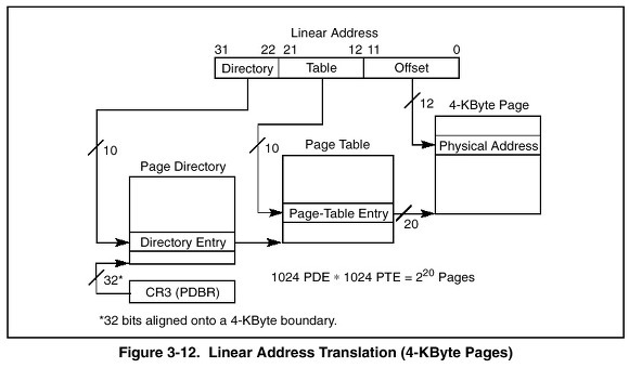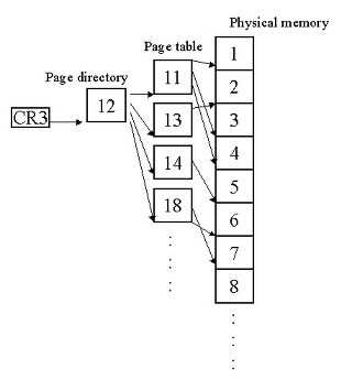 그림에서 보듯이 CR3를 root로 해서 tree 구조를 형성하고 있습니다. CR3를 제외한 하나의 사각형은 모두 4KB짜리 페이지를 나타냅니다. 따라서 하나의 사각형당 최대 1024개의 화살표를 가질 수 있습니다. 위의 그림에서 page directory에서부터 각 level에서 가상 주소의 각 10비트씩을 index로 사용하여 최종 단계로 가서 실제 물리 Page의 주소를 얻게 됩니다. 이렇게 얻은 주소에 12bit의 offset을 합치면 물리 주소가 됩니다. 여기서 사각형 안에 있는 번호는 물리 page number임을 주의하시기 바랍니다. 실제 개념도는 tree로 표현하였지만 page directory와 page table등은 모두 실제 메모리를 차지하는 하나의 page이기 때문에 실제로는 각 번호대로 일렬로 그려야 할 것입니다. 이러한 실제 메모리에 대한 그림을 뒤에 넣었으니 참조하시기 바랍니다. 하나의 page table은 1024개의 entry를 가지고, 한 개의 entry가 한 개의 page를 가리키기 때문에, 하나의 page table은 1024개의 page를 가리킬 수 있습니다. 역시 한 개의 page directory에 의해서 1024개의 page table을 가리키기 때문에, 하나의 page directory는 총 1024*1024개의 page를 가리킬 수 있게 됩니다. 이는 곧 4GB의 공간을 나타낼 수 있습니다. 하지만 실제로 이 모든 맵핑을 한다면, page directory와 page table을 위해서 1025개의 page를 소모하는 꼴이 됩니다. 대략 4MB의 용량입니다. 하나의 프로세스가 이 맵핑을 위해 4MB씩을 소모할 수는 없기 때문에 필요로 하는 부분만을 맵핑하여 사용합니다. 위의 그림에서 12번 물리 페이지를 사용하는 page directory는 4개의 화살표만을 가지고 있습니다. 이것은 곧, 5번째 이후의 entry들은 null일테고, mapping이 존재하지 않는다는 뜻입니다. 즉, 해당 가상 주소에 대한 가상 주소 공간가 존재하지 않는다는 것입니다. 한 개의 page directory entry는 1개의 page table에 대응하고, 하나의 page table은 4MB를 커버하기 때문에, 4개의 화살표는 0~16MB의 공간을 뜻합니다. 위 그림에서는 16MB까지만의 가상 주소만 유효한 것으로 생각하시면 됩니다. 다시 말해 Page table에서도 모든 화살표가 있는 것이 아니기 때문에, 화살표가 있는 부분만이 유요한 주소공간이라고 할 수 있습니다. 그렇다면 유효하지 않는 주소 공간으로 접근하게 되면 어떻게 될까요? 이런 경우에는 당연 page fault가 발생합니다.