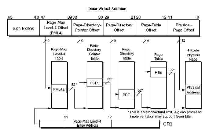 위의 그림은 64비트의 경우입니다. 32bit의 경우를 확장한 것인데, 처음 4G의 물리메모리가 부족해지자 인텔은 PAE(Physical address extension)이라는 이름으로 물리 주소를 36비트로 확장하고, page table구조를 바꾸게 됩니다. 각 엔트리는 크기가 2배로 늘어 한 페이지안에는 512개의 엔트리만이 들어가게 되었습니다. AMD가 이 구조를 약간 확장하여 하나의 level을 더 추가하여 64비트에서도 계속 사용합니다.