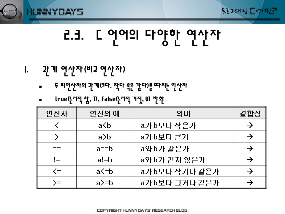 두 피연산자의 관계(크다, 작다 혹은 같다)를 따지는 연산자