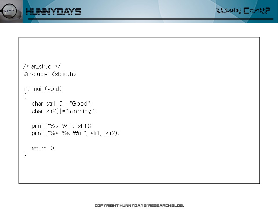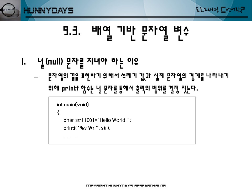 – 문자열의 끝을 표현하기 위해서 쓰레기 값과 실제 문자열의 경계를 나타내기 위해 printf 함수는 널 문자를 통해서 출력의 범위를 결정 짓는다.