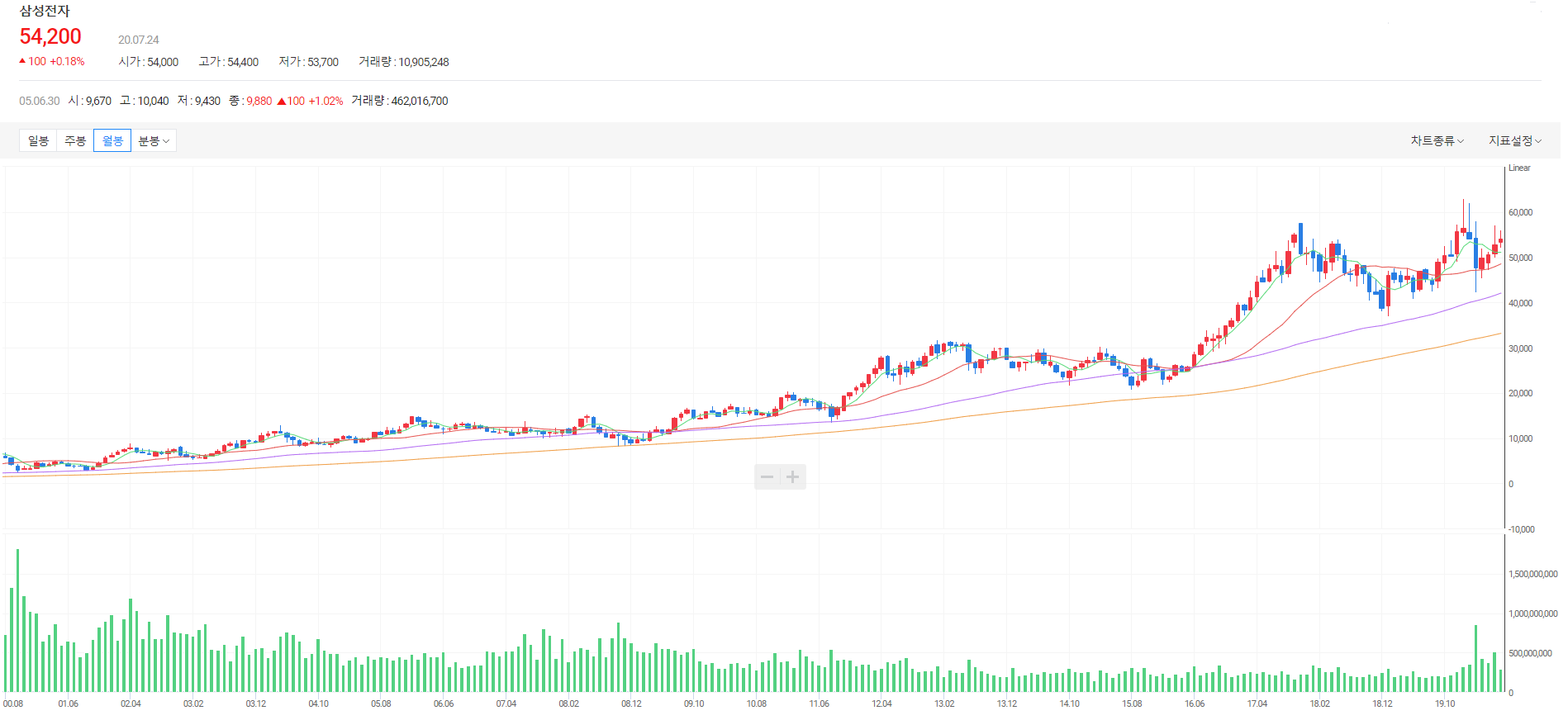 지난 20년간 삼성전자 주식 시가총액은 꾸준히 증가세를 보이고 있습니다.